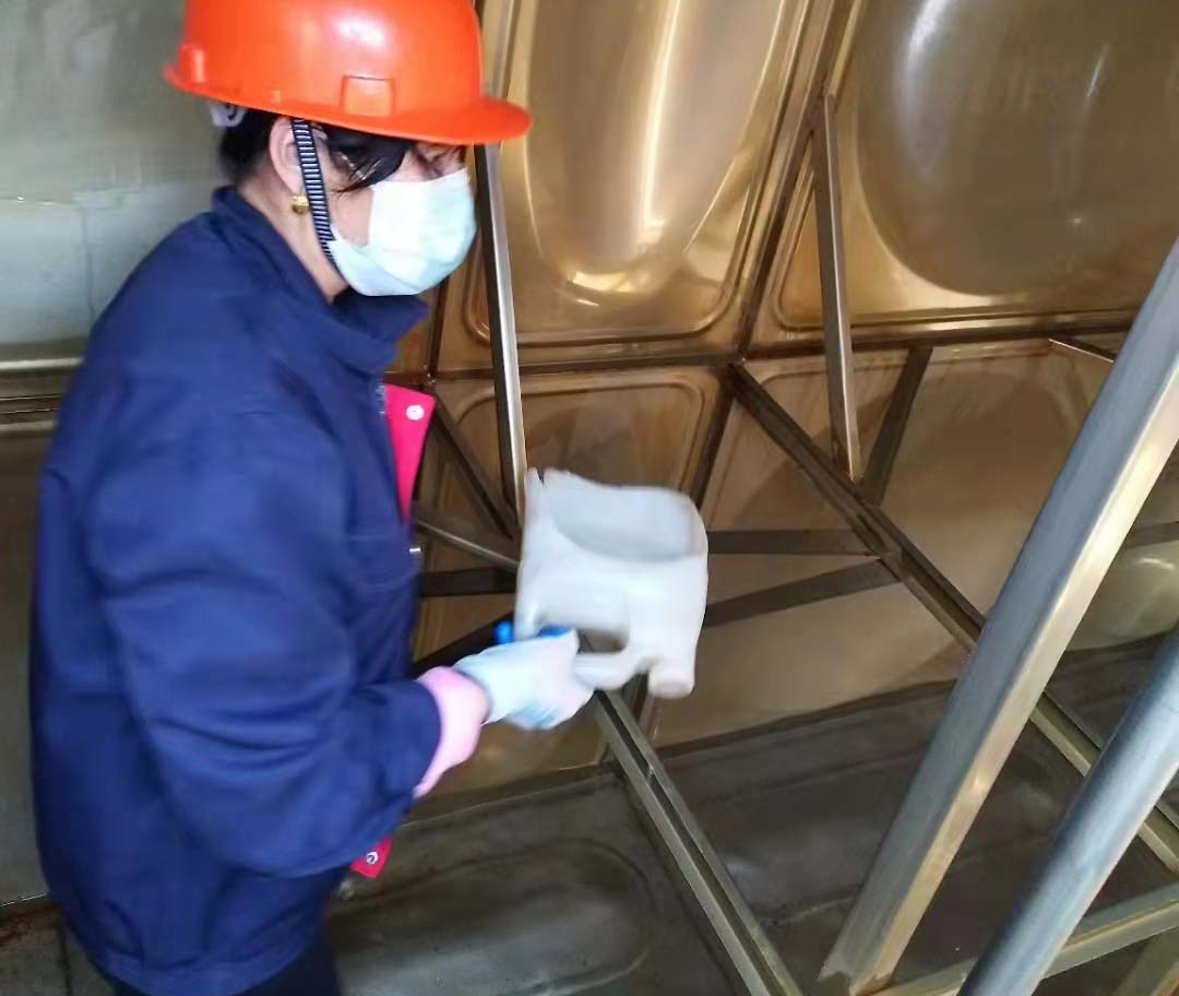 在清洗水箱的過程中,消毒人員須帶護眼鏡、口罩,如在水箱內(nèi)感到